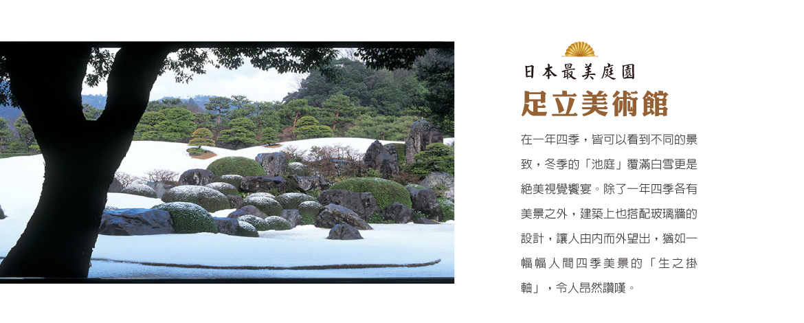 【足立美術館】分有本館與新館,本館主要展示橫山大觀與近代日本作品,新館則多為現代日本畫作。此外美術館內也有諸多著名陶藝家河井寬次郎和北大路魯山人的作品展出,雲集了各方日本傑出藝術家的作品所在。連續十五年皆獲得日本最美庭園,實屬當之無愧。在一年四季,皆可以看到不同的景致,春季可見綠意盎然的「苔園」;夏季有軟青碧綠的「白砂青松庭」;秋有世外美景「枯山水庭」;冬季的「池庭」覆滿白雪更是絕美視覺饗宴。除了一年四季各有美景之外,建築上也搭配玻璃牆的設計,讓人由內而外望出,猶如一幅幅人間四季美景的「生之掛軸」,令人昂然讚嘆。