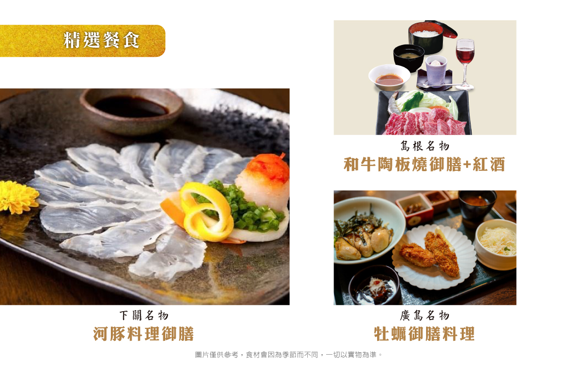 ※素食旅客請注意:由於疫情後日本餐廳人力短缺,廚師主要工作為提供餐廳常規餐食,對於素食恐無法精心料理,故須以餐廳所提供之內容為主,餐廳不接受現場指定或增加菜餚(例如炒一盤青菜等),如擔心料理不合口味,敬請旅客自備罐頭素食備用,敬請理解配合,謝謝。