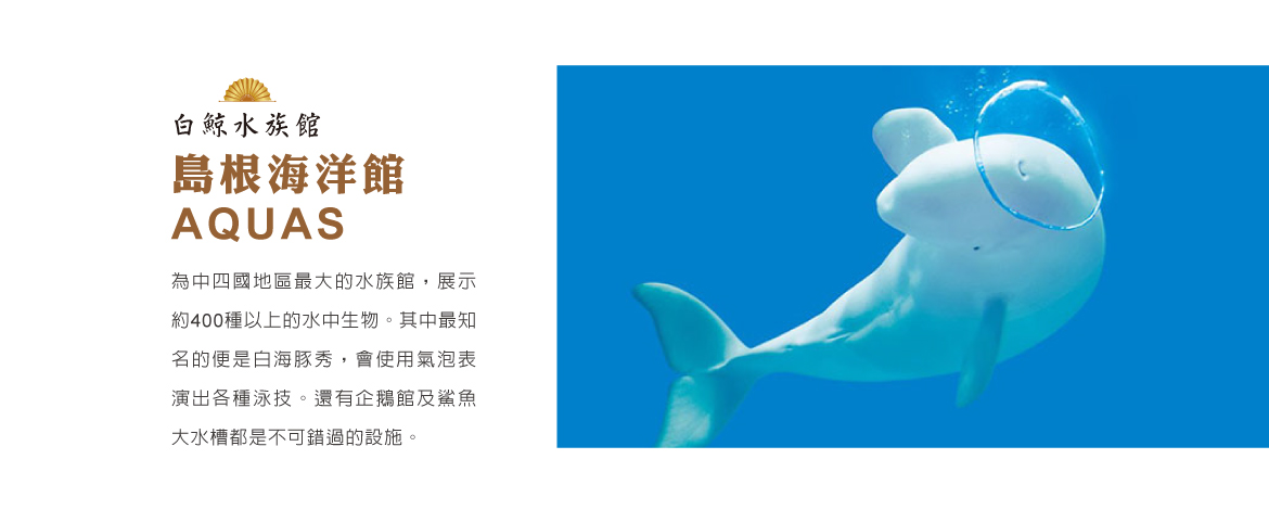 【島根海洋館AQUAS】為中四國地區最大的水族館,展示約400種以上的水中生物。其中最知名的便是白海豚秀,會使用氣泡表演出各種泳技。還有企鵝館及鯊魚大水槽都是不可錯過的設施。