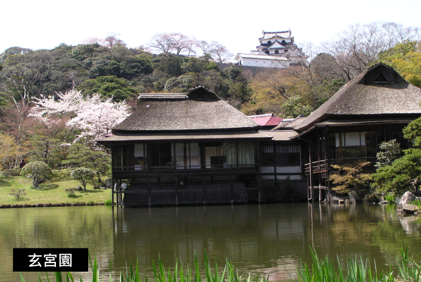 【玄宮園】玄宮園是位於日本滋賀縣彥根市彥根城內的一座江戶時代大名庭園,建於1677年,以中國的「瀟湘八景」為藍本,對照日本的「近江八景」建造而成,屬於大池泉回遊式庭園。 園內引琵琶湖的水,可欣賞到如倒映著彥根城天守閣的美景,並有臨池閣、鳳翔台等建築。 玄宮園是日本國家指定特別史蹟「彥根城」的一部分,也和庭園旁的「樂樂園」合稱為「玄宮樂樂園」。