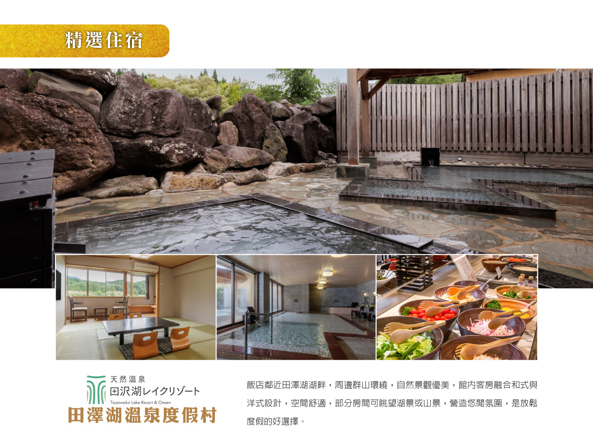 【田澤湖溫泉】溫泉區域包含田澤湖高原溫泉鄉、水澤溫泉鄉及乳頭溫泉鄉等,泉質多樣,以硫磺泉、單純泉與弱鹽泉為主,據說對神經痛、關節痛、皮膚病及疲勞恢復皆有良效。溫泉鄉氛圍悠閒寧靜,部分飯店提供露天風呂與大浴場,冬季時可在溫泉中感受雪景圍繞的療癒體驗。