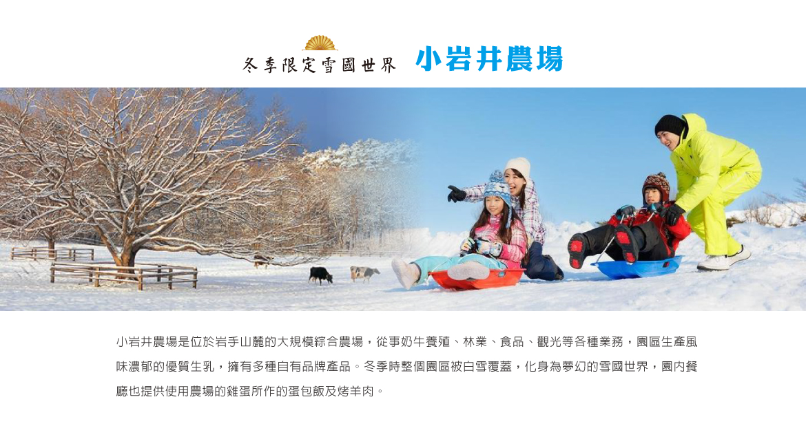 ,園區生產風味濃郁的優質生乳,擁有多種自有品牌產品。冬季時整個園區被白雪覆蓋,化身為夢幻的雪國世界,園內餐廳也提供使用農場的雞蛋所作的蛋包飯及烤羊肉。