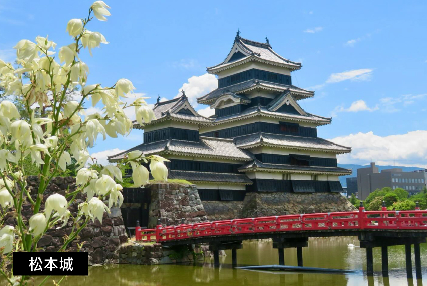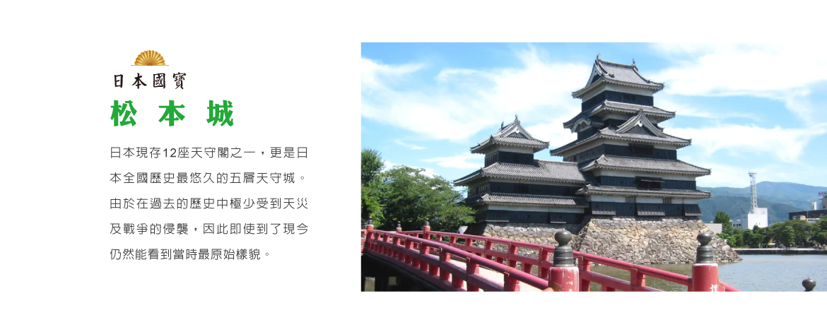 【松本城】松本城位於日本長野縣松本市,是日本現存最古老的五重六層木造天守閣,與姬路城、犬山城、彥根城、松江城同列為國寶五城。其獨特的「黑白對比」外觀,以黑色板材覆蓋下部、白色灰泥塗抹上部,被譽為「烏城」,背景則為雄偉的北阿爾卑斯山,四季景色皆美。