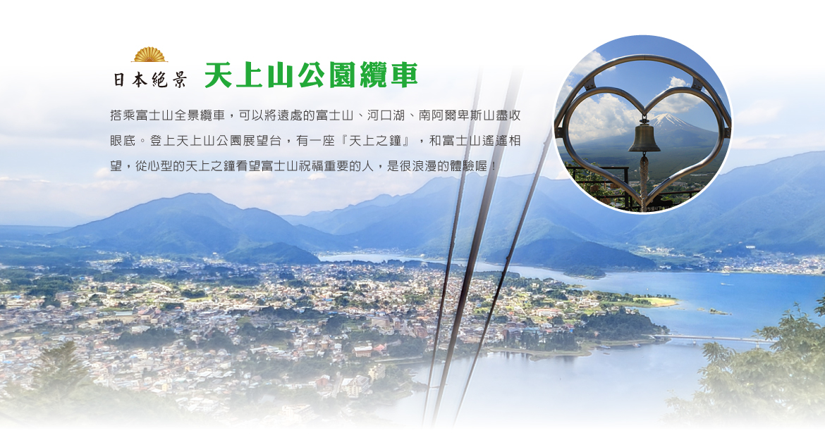 【河口湖天上纜車】日本河口湖天上山公園纜車是欣賞河口湖與富士山絕景的經典地標,從山下「湖畔站」至「富士見台站」僅需約 3 分鐘,即可俯瞰河口湖及完整的富士山全景。山上可拍照景點包括「天上之鐘」、兔子神社、狸貓茶屋,以及熱門的「絕景鞦韆」。