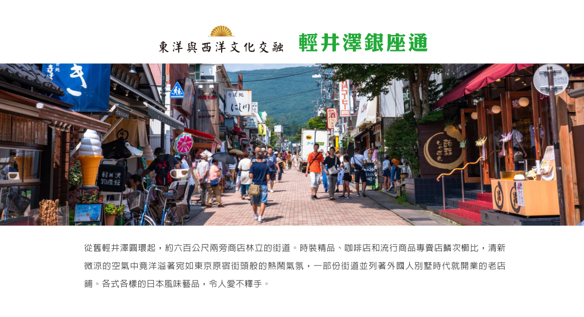 【輕井澤銀座通】從舊輕井澤圓環起,約六百公尺兩旁商店林立的街道。時裝精品、咖啡店和流行商品專賣店鱗次櫛比,清新微涼的空氣中竟洋溢著宛如東京原宿街頭般的熱鬧氣氛,一部份街道並列著外國人別墅時代就開業的老店鋪。各式各樣的日本風味藝品,在在令人愛不釋手。