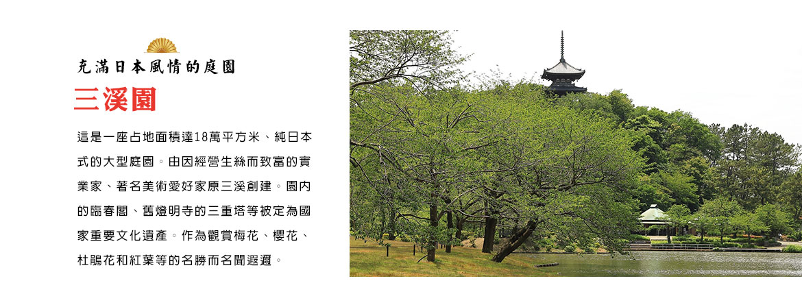【三溪園】這個已有百年歷史的日本庭園,由當年叱吒生絲貿易商場的企業家原三溪先生所建造。三溪園內有許多從京都、鎌倉等地移築而來的日式歷史建物,並巧妙配置、種植了梅花、櫻花、杜鵑花、楓樹等花木。在充滿西洋色彩的橫濱市中心中,這麼一座能飽覽日式風情的庭院,長年以來深受市民與遊客的青睞。