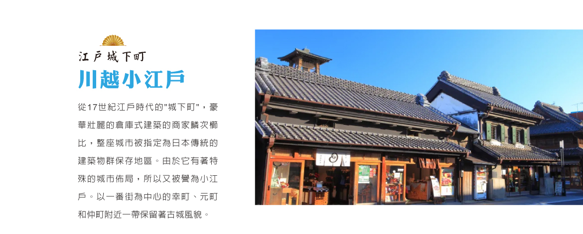 【川越小江戶街道】從17世紀江戶時代的"城下町",豪華壯麗的倉庫式建築的商家鱗次櫛比,整座城市被指定為日本傳統的建築物群保存地區。由於它有著特殊的城市佈局,所以又被譽為小江戶。以一番街為中心的幸町、元町和仲町附近一帶,保留著在關東地區也是屈指可數的古城風貌。川越另一個頗為出名的是點心鋪街,道路兩邊店鋪林立,出售糖果、山芋糕和煎餅等各種點心。這些糕點保持著傳統的民間風味,令遊人在味覺和精神上都能享受到淳樸的溫馨。