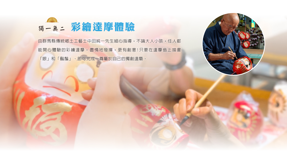 【達摩彩繪體驗】開心參加《彩繪達摩》體驗,讓您留下最美好深刻的回憶!在老師傅全心全意製作的達摩翁上描畫您真誠的心願,意義非凡、獨一無二!由群馬縣傳統鄉土工藝士中田純一先生細心指導,不論大人小孩,任人都能開心體驗的彩繪達摩,盡情地發揮,更有創意 !!「彩繪達摩體驗」所使用的是高約12公分(約成年人的拳頭大小)的原型達摩。只要在達摩翁上描畫「眼」和「鬍鬚」、即可完成一尊屬於自己的獨創達磨。「彩繪達摩體驗」內容包括說明講解和工房參觀見學,費時30分鐘左右。自己描繪的達摩翁還可帶回作紀念喔!