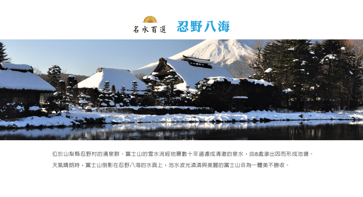 【忍野八海】位於山梨縣忍野村的湧泉群。富士山的雪水流經地層數十年過濾成清澈的泉水,由8處滲出因而形成池塘。其秀麗的田園風光,美不勝收。富士山是日本人心目中的第一神山,隨著四季呈現出不同的風貌,神秘又神奇。天氣晴朗時,如此的景色倒影在忍野八海的水面上,池水波光潾潾與美麗的富士山合為一體。由這裡觀賞富士山,跟其他地區比較,別有其獨特的風格,被譽為忍野富士。除了被選為名水百選,也被認定為天然記念物及新富岳百景之一。