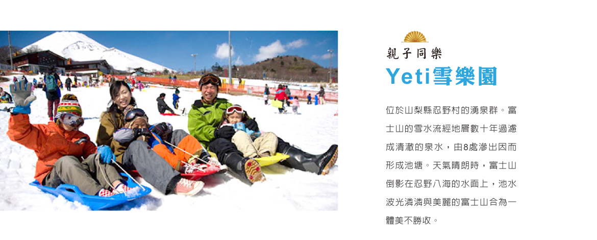 Yeti雪樂園富士山二合目標高1400公尺,每年10月就開放,號稱日本最早的雪樂園。當中共有ABCD四組滑雪道,最長約1公里,高低落差約達150公尺,適合初、中階滑雪者。另外還設有「活動遊樂公園」,可供親子們或是想玩雪的遊客們在此體驗滑雪盆的樂趣。