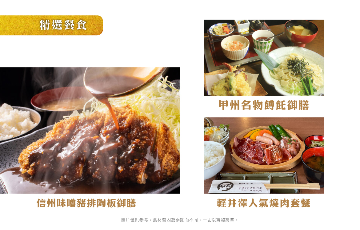 ※素食旅客請注意:由於疫情後日本餐廳人力短缺,廚師主要工作為提供餐廳常規餐食,對於素食恐無法精心料理,故須以餐廳所提供之內容為主,餐廳不接受現場指定或增加菜餚(例如炒一盤青菜等),如擔心料理不合口味,敬請旅客自備罐頭素食備用,敬請理解配合,謝謝。