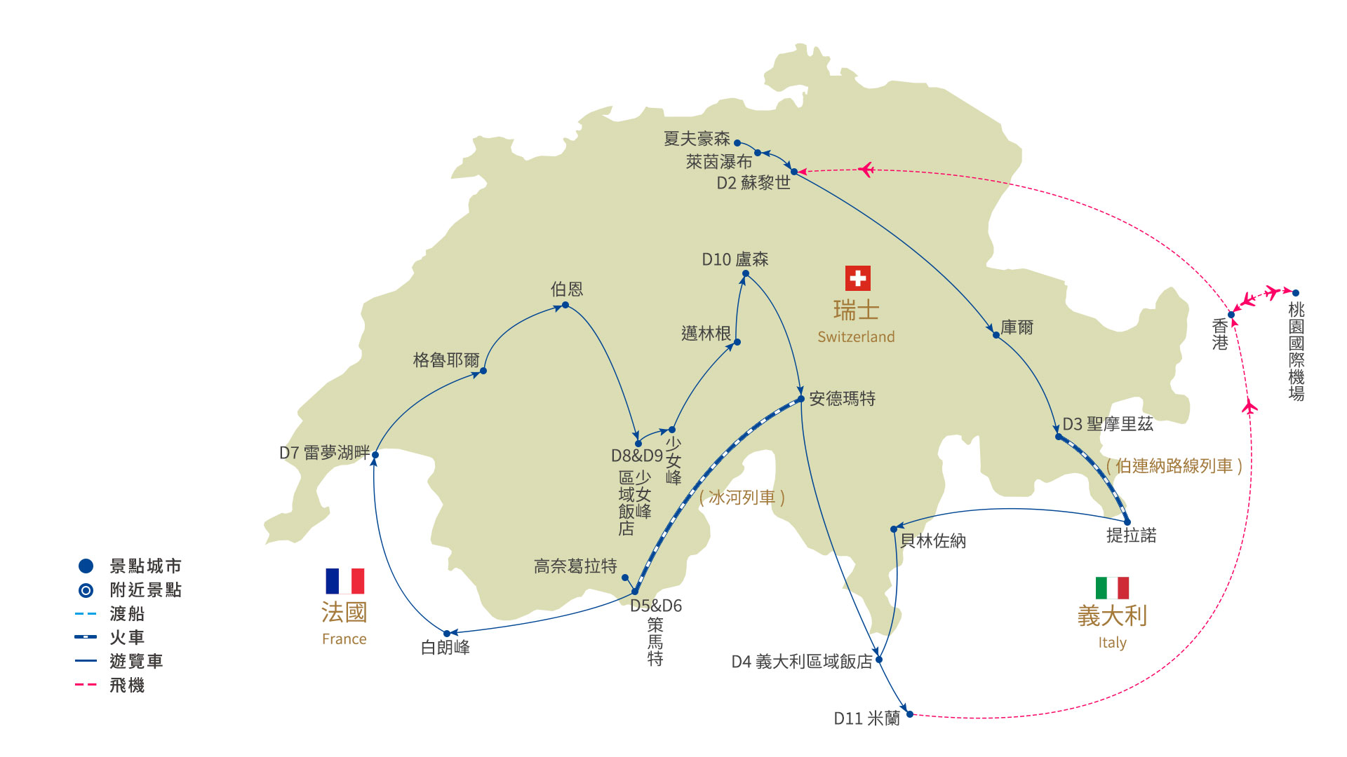 特別說明: 1.如遇冰河列車所有艙等皆客滿、鐵路維修或故障等不可抗力因素,將改安排搭乘行駛於冰河列車景觀路線之瑞士國鐵列車(中途需轉車),並退費NT$1000。 2.如因氣候因素或機械維修等不可抗力因素致冰河列車路線火車全面停駛,將改安排搭乘團體大巴,並退還火車票費用。 3.因冰河列車班次、座位有限,一位難求,如有異動本公司最晚將於出發前7日通知預訂狀況。 4冰河列車年度維修期間,此期間將改搭乘行駛於冰河列車景觀路線之瑞士國鐵列車(中途需轉車),請見諒。 5.特別說明:如遇冰河列車全車預約額滿,將改搭行駛於冰河列車景觀路線之瑞士國鐵列車,敬請了解