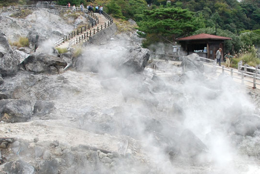 【地獄谷】由於蒸汽和溫泉酸性水的影響,而使得土壤退色變為白色的粘土狀,故被稱為「溫泉餘土」。據說溫泉的熱源是桔灣海底的岩漿流,從地底湧出裊裊白煙的蒸汽,溫度高達攝氏120度,在噴氣孔周圍附著著白色或黃色的硫磺花,雲仙的硫磺花不是沉澱在溫泉中,而是附著在地表附近,這也是雲仙地獄谷的一大特色。