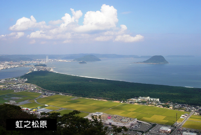 【虹之松原】國家特別名勝,與三保松原、氣比松原並列「日本三大松原」。這片長約 4.5 公里、寬約 500 公尺的海岸防風林,由 17 世紀初種植的約 100 萬棵黑松組成,弧形海岸宛如彩虹,可在「鏡山展望台」俯瞰其壯麗景色。