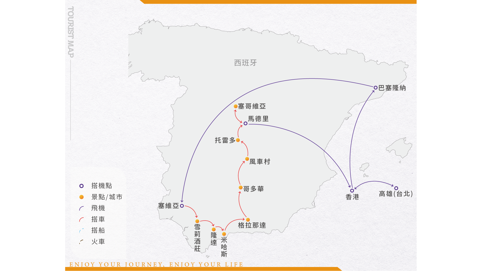 今日準備好行李及裝滿希望的行囊,集合於高雄小港(桃園)國際機場,專人協辦出境手續後,搭乘豪華客機飛往陽光國度-西班牙,一趟浪漫熱情的饗宴也隨之開始。在滿懷憧憬與期待下,我們將發現更真實的西班牙。