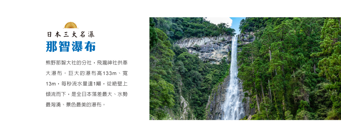 【那智瀑布】那智的瀑布是高低落差133m (全日本最高)、瀑布口寬幅13m、瀑布底深度10m,1段式的瀑布,是因而誇耀於日本第一的瀑布。屬於日本三大名瀑的其中之一,指定為國家的名勝,作為聯合國教科文組織的世界遺產的「紀伊山地的聖地及參拜道」的一部分。此外,這裡是只有以數字無法形容的超美瀑布,連美國CNN都將其選入「31個日本最美麗場所」的排行榜中。真的是名副其實日本第一的瀑布喔。