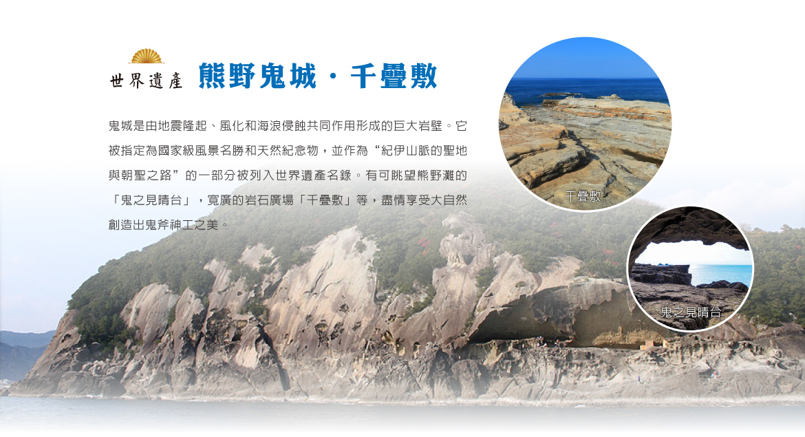 【鬼城】奇岩怪石所形成天然紀念物,由於岩壁長年受到海風吹拂及海水侵蝕,造成海邊突出的峭岩約一公里的海蝕洞窟以及千層石形成的奇岩怪石,如:犬、猿、蜂巢等十分奇特。被指定為國家名勝.天然紀念物。由岩石上往下看海浪拍打在岩石上而濺開的白色浪花,非常有魄力。