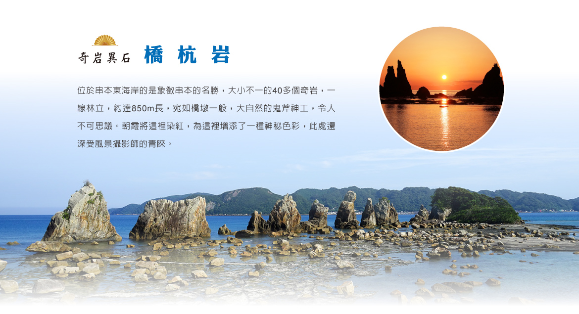 【橋杭岩】位於串本東海岸的是象徵串本的奇勝,大小不一的40多個奇岩,一線林立,約達850m長,宛如橋墩一般,大自然的鬼斧神工,令人不可思議。朝霞將這裡染紅,為這裡增添了一種神秘色彩,此處還深受風景攝影師的青睞。據說當年弘法大師曾想在這裡架橋。被列為國家指定特別天然紀念物。