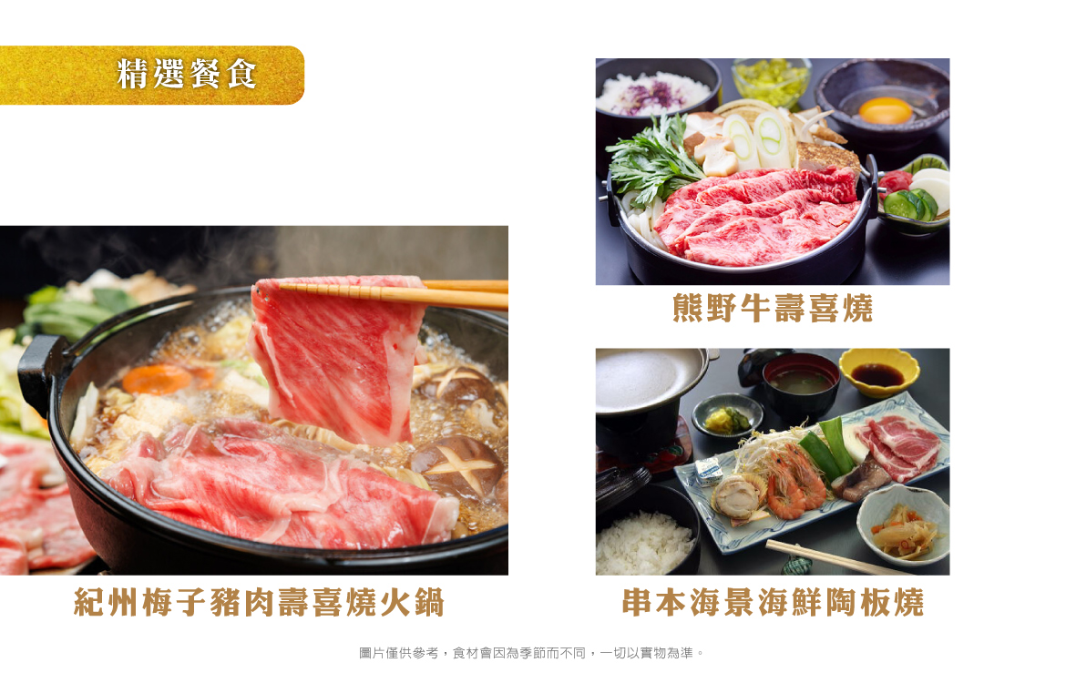 ※素食旅客請注意:由於疫情後日本餐廳人力短缺,廚師主要工作為提供餐廳常規餐食,對於素食恐無法精心料理,故須以餐廳所提供之內容為主,餐廳不接受現場指定或增加菜餚(例如炒一盤青菜等),如擔心料理不合口味,敬請旅客自備罐頭素食備用,敬請理解配合,謝謝。
