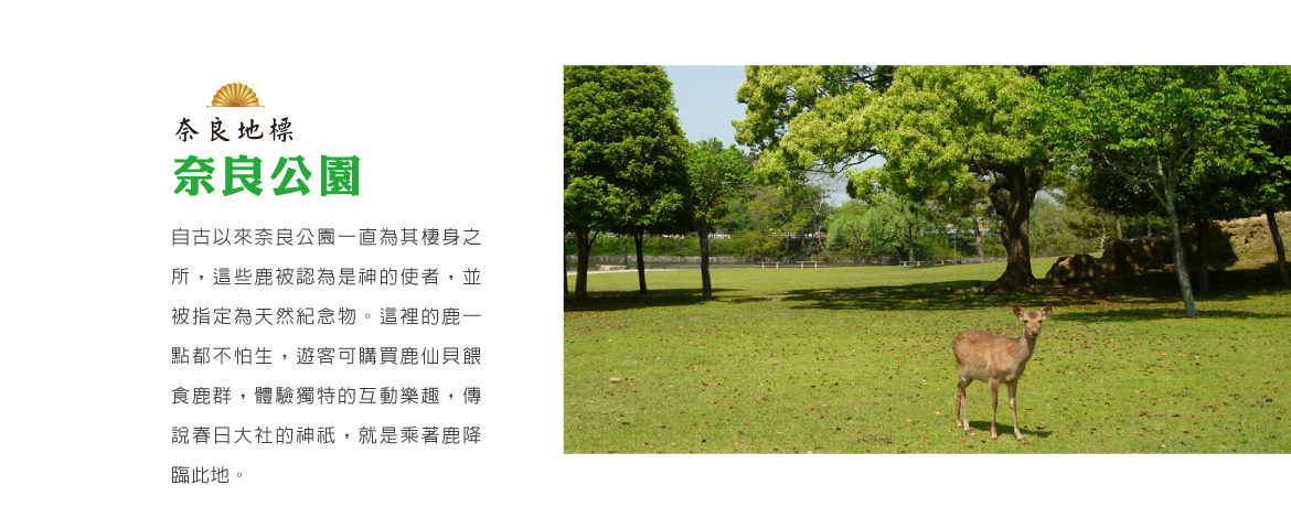 【奈良公園】公園佔地約660公頃,公園中約有著將近1200頭的野生鹿群,自古以來奈良公園一直為其棲身之所,這些鹿被認為是神的使者,並被指定為天然紀念物,成為奈良的象徵之一。這裡的鹿一點都不怕生,遊客可購買鹿仙貝餵食鹿群,體驗獨特的互動樂趣,傳說春日大社的神祇,就是乘著鹿降臨此地。
