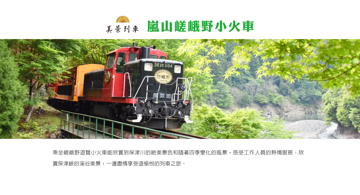 【嵐山小火車】是京都的一條風景鐵道,提供遊客從嵐山到龜岡的沿河景觀旅程,這條小火車路線穿越美麗的山間景色,沿途可以欣賞到豐富的自然美景,是京都旅遊的熱門景點之一。嵐山小火車不僅是一種交通工具,更是一種休閒的體驗,讓遊客在舒適的車廂內放鬆,欣賞沿途的絕美風光。